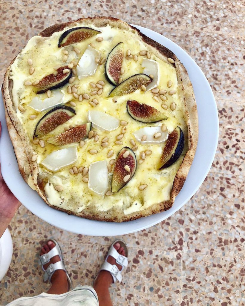 15-minuterslunchen. På med pizzastenen på grillen, ta fram ett libabröd och lägg på ett lager crème fraiche, riven cheddarost och chèvre. Grilla på pizzastenen 5-10 minuter. Lägg upp på tallrik och toppa med pinjenötter, färska fikon (gärna direkt från fruktmarknaden 💛) och ringla över honung. Mat man blir extremt GLAD (och mätt) av! 🔥