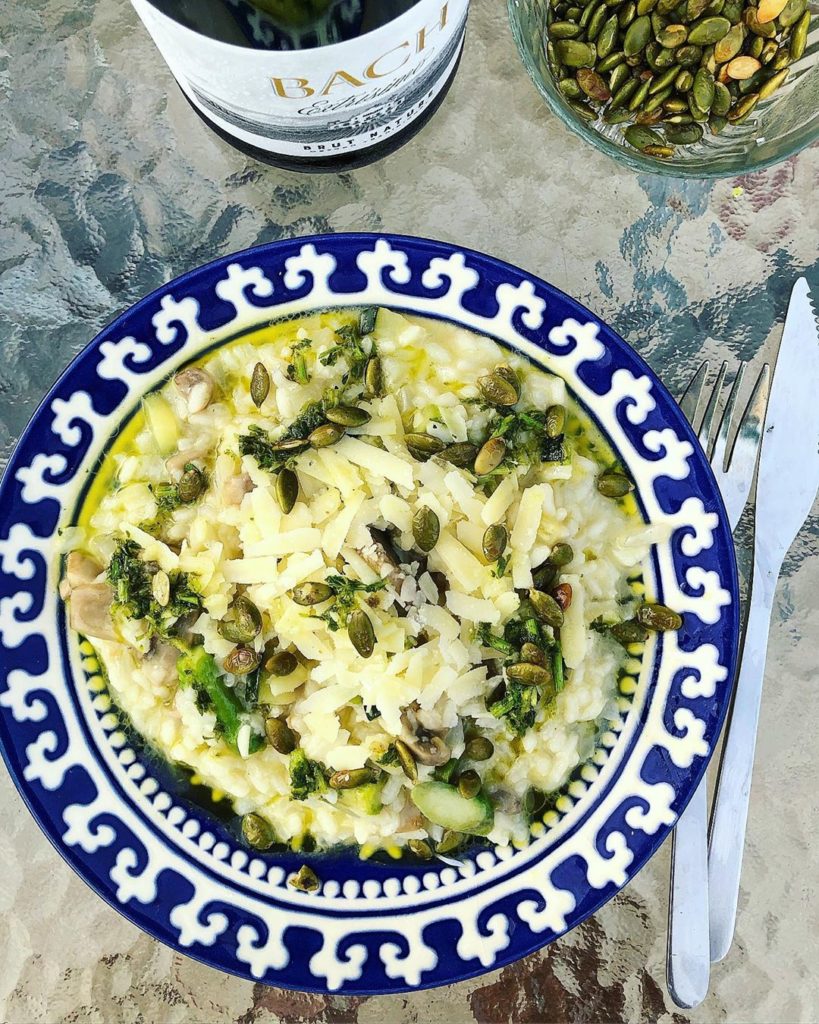 Denna 🍋RISOTTO🍋 med champinjoner, sparris och zucchini har vi gjort såå många gånger. En riktig favorit med andra ord! Däremot har vi inte provat att toppa med gremolataolja och rostade pumpakärnor förut och JÖSSES vilket lyft! Supergott blev ännu godare! Blanda olivolja med citronzest, citronsaft, riven vitlök, hackad persilja, salt och peppar. Ringla över risotton. Rosta pumpakärnor. Strö över. Och riv över mer parmesan också. •