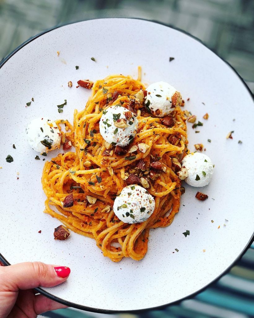 Igår lagades pasta med 🌱ROSTAD TOMATPESTO🌱! 100% inspiration från @tuvessonskan och 100% värt! Recept finns i hennes flöde. Vi saltrostade mandlarna innan, hade i någon klyfta av den rostade vitlöken och tog champagnevinäger ist för vitvinsvinäger. Plus fryst basilika. Och chiliflakes var givet. Annars lika samma! Serverades med labnehbollar, dvs grekisk yoghurt som fått rinna av sig i 2,5 dygn ihop med salt och basilika för att sen rullas till bollar. Mer saltrostade mandlar, chiliflakes och basilika. Fryst såklart, finns alltid hemma att ta till när helst det behövs! 🌱